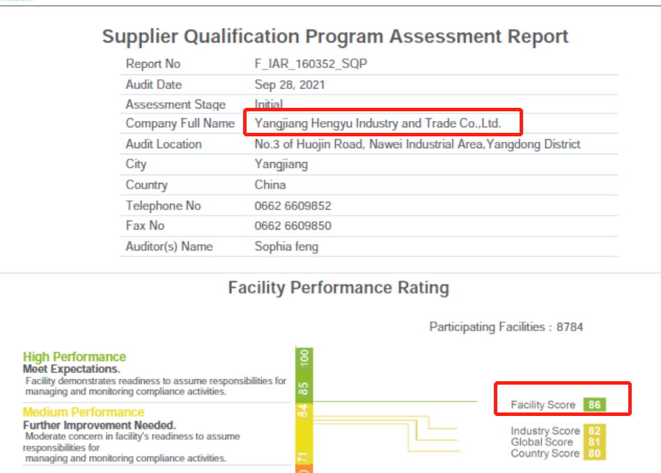 陽江市恒裕工貿2021年在創思維輔導下通過WCA/SQP驗廠,并取得WCA最高等級綠燈86分。