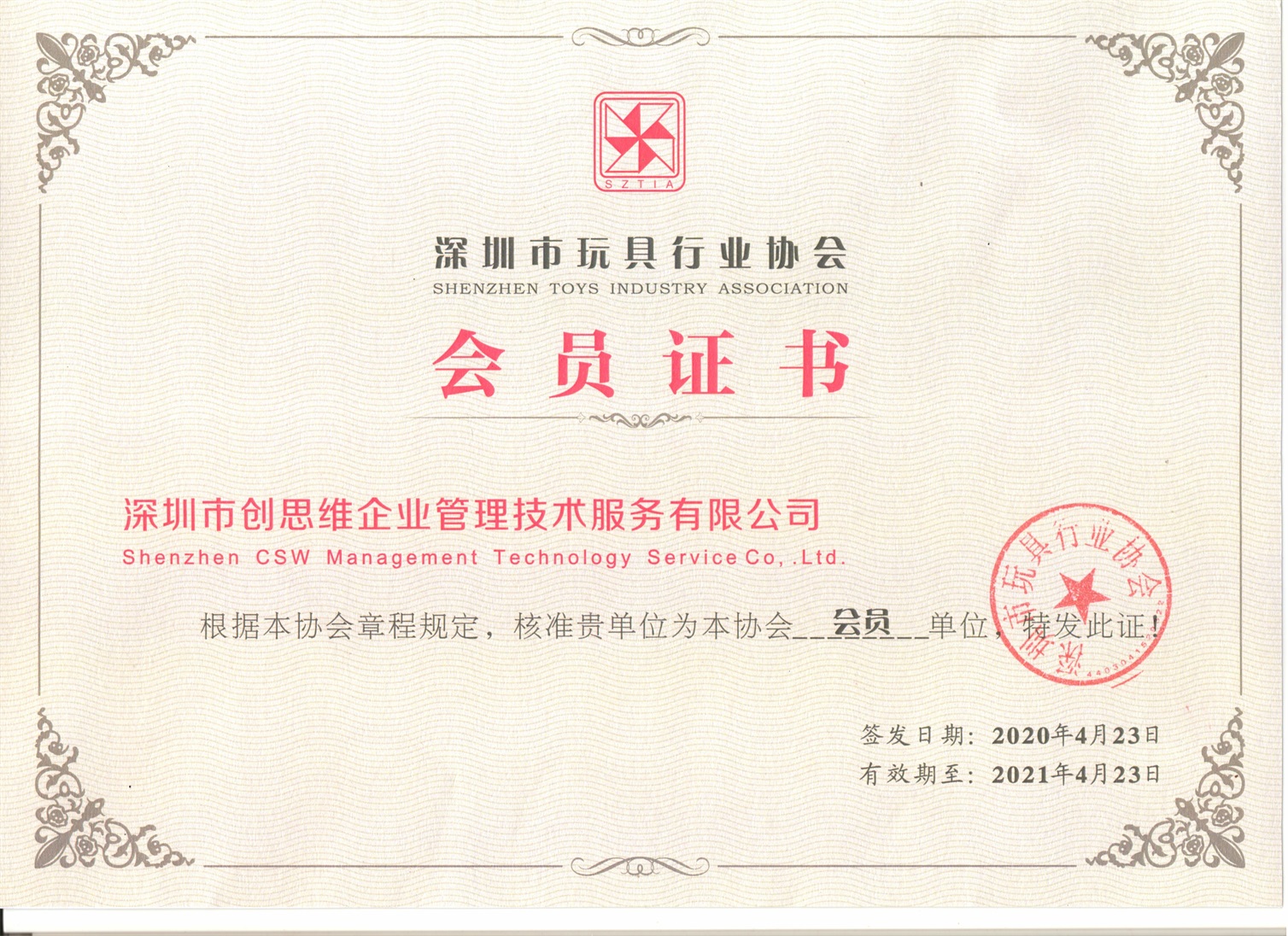 2021年優(yōu)秀會員企業(yè)證書